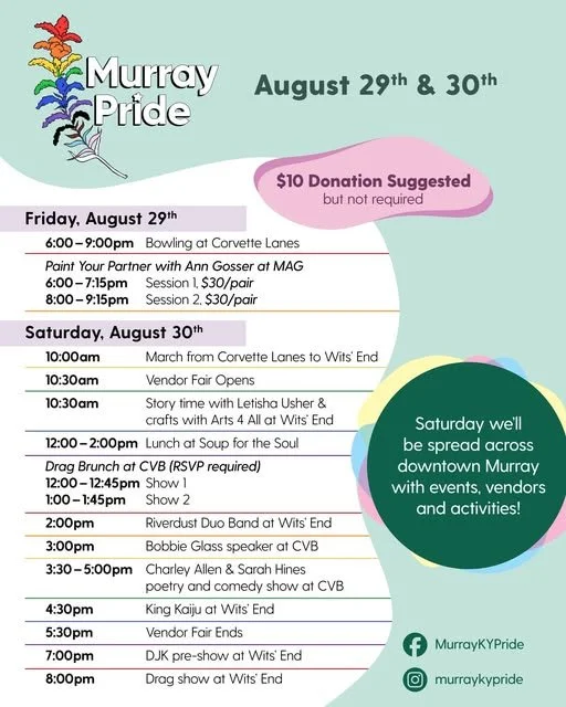 Back to All Events Murray Pride Fest Friday, August 29, 2025 6:00 PM Saturday, August 30, 2025 10:00 PM Downtown Murray 206 S 4th St MURRAY United States (map) Google Calendar ICS Mark your calendars! The Murray KY Pride festival is almost here. Check out the schedule of events and get ready to celebrate with us all weekend long!Details subject to change, so keep an eye on our socials for the latest updates.