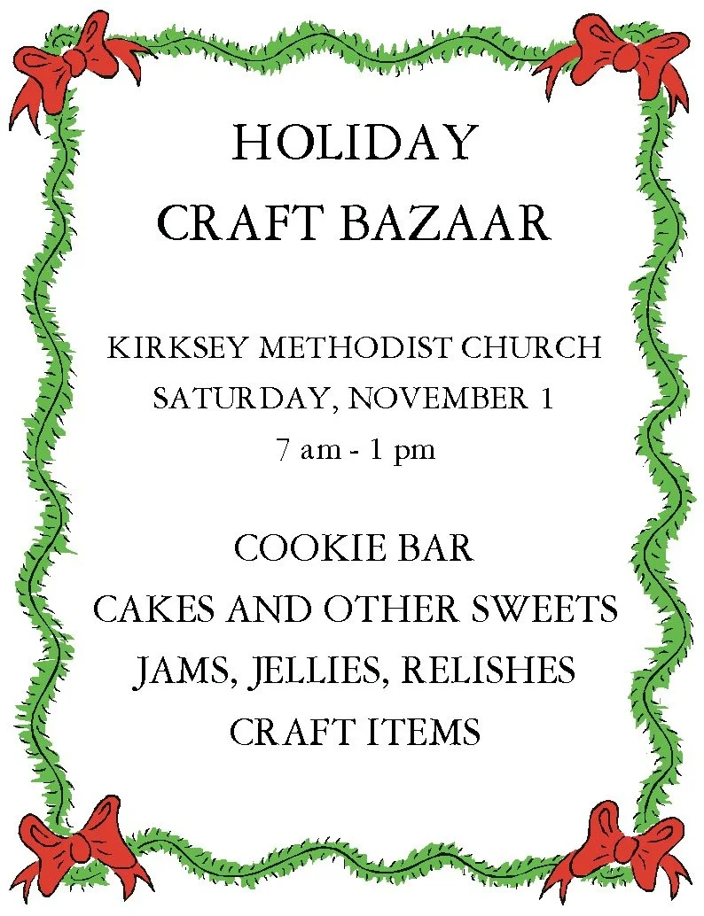 Kirksey United Methodist Church will be hosting its annual holiday bazaar on Saturday, November 1st, from 7:00 am to 1:00 pm in the Fellowship Hall.