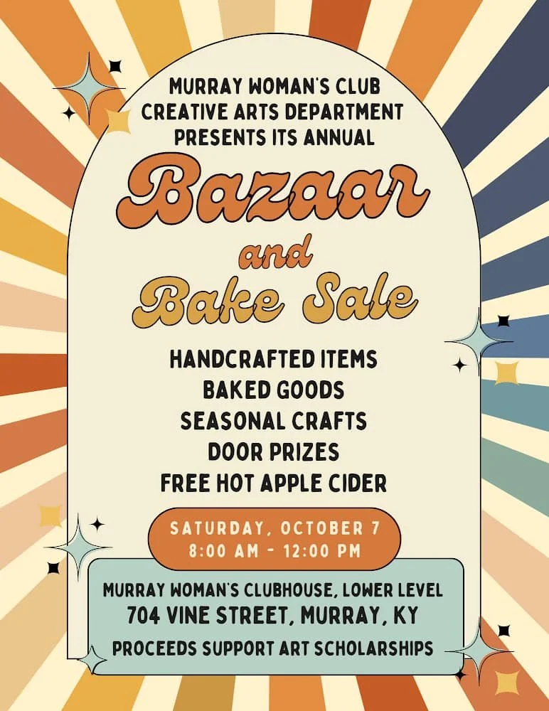 The Creative Arts Department's annual BAZAAR & BAKE SALE is fast approaching. You are invited to attend (and purchase!) and also, if you are willing, may bake a cake, pie, cookies, and/or ANY goody for the Bake Sale. The Bazaar and Bake Sale benefit some wonderful opportunities for the youth in our community.