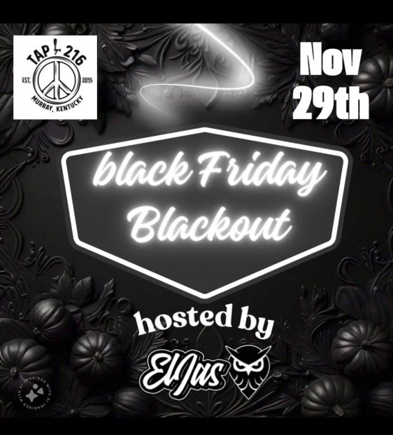 Black Friday Blackout at Tap 216 Friday, November 29, 2024 9:00 PM 10:00 PM Tap 216 216 North 15th Street Murray, KY, 42071 United States (map) Google Calendar ICS Come wearing ALL BLACK for Tap 216’s Black Friday Blackout Event featuring DJ El Jas rocking all your favorite requests! Black Friday Pitcher and Food Specials all day!