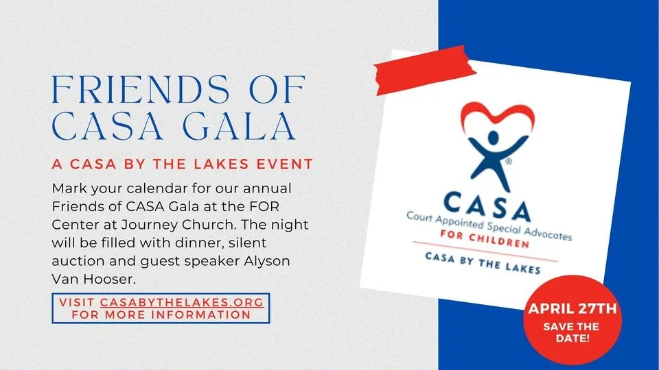 CASA Gala Thursday, April 27, 2023 6:00 PM 9:00 PM Google Calendar ICS Please join us for our annual Friends of CASA Gala! The evening will include dinner, a silent auction and guest speaker Alyson Van Hooser! Learn more about CASA by the Lakes and support our organization!