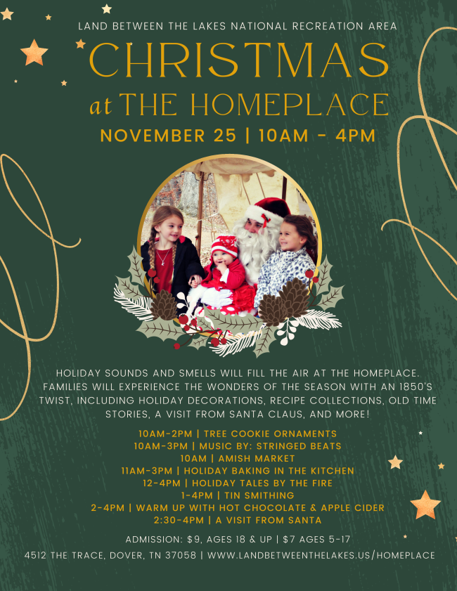 Holiday sounds and smells will fill the air at the Homeplace. Families will experience the wonders of the season with an 1850's twist, including holiday decorations, recipe collections, old time stories, music and a visit from Santa Claus!