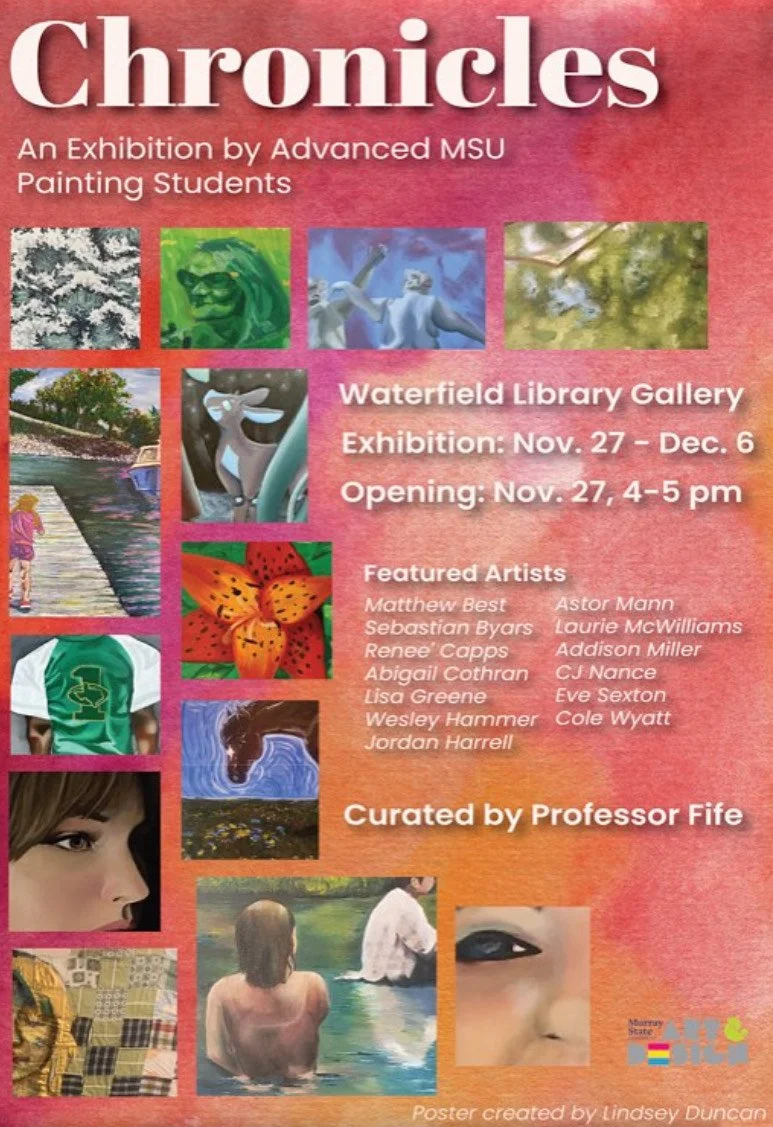 Chronicles: An Exhibition by Advanced MSU Painting Students Monday, November 27, 2023 4:00 PM Wednesday, December 6, 2023 5:00 PM Waterfield Library Gallery 1400 North 15th Street Murray, KY, 42071 United States (map) Google Calendar ICS “Chronicles” opens for the last week of classes. This show highlights the work of Prof Jessica Fife’s advanced painting students. The show will be up in the Library Gallery in Waterfield, with a reception on Monday 27 Nov at 4pm.The event is free and open to the public.