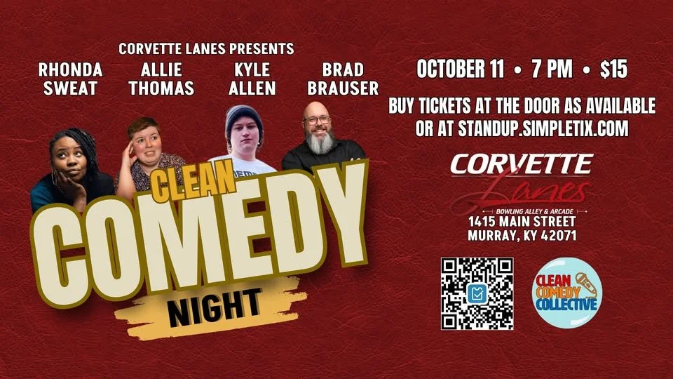 Join us for another night of stand up comedy at Corvette Lanes! Rhonda Sweat (Nashville, TN), Allie Thomas (Nashville, TN), and Kyle Allen (Mayfield, KY) will keep you and the whole family laughing all night! Hosted by Brad Brauser (Murray, KY).