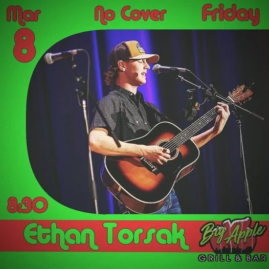 Friday March 8th at 8:30 we have Ethan Torsak playing. There is no cover charge. Come on out and listen to some great music.