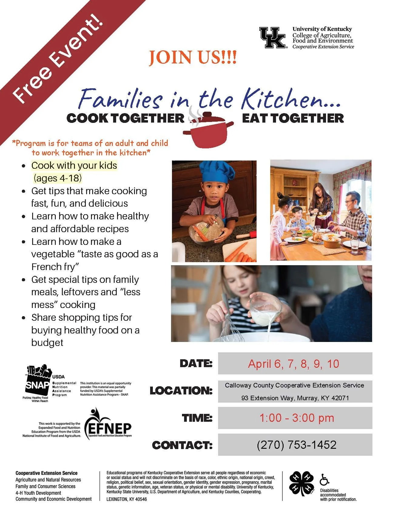 Back to All Events Families in the Kitchen @ Calloway County Extension Office Friday, April 10, 2026 1:00 PM 2:00 PM Calloway County Extension Office 93 Extension Way Murray, KY, 42071 United States (map) Google Calendar ICS