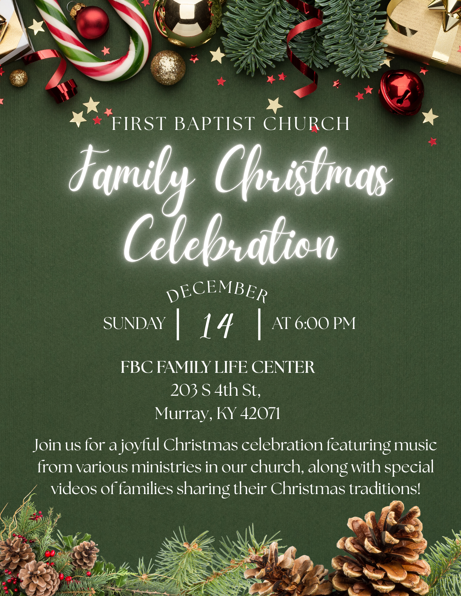 First Baptist Church Family Christmas Celebration Sunday, December 14, 2025 6:00 PM 8:00 PM First Baptist Church 203 South 4th Street Murray, KY, 42071 United States (map) Google Calendar ICS Celebrate the season at First Baptist Church including festive performances from various church groups and a look into important family traditions throughout the church.