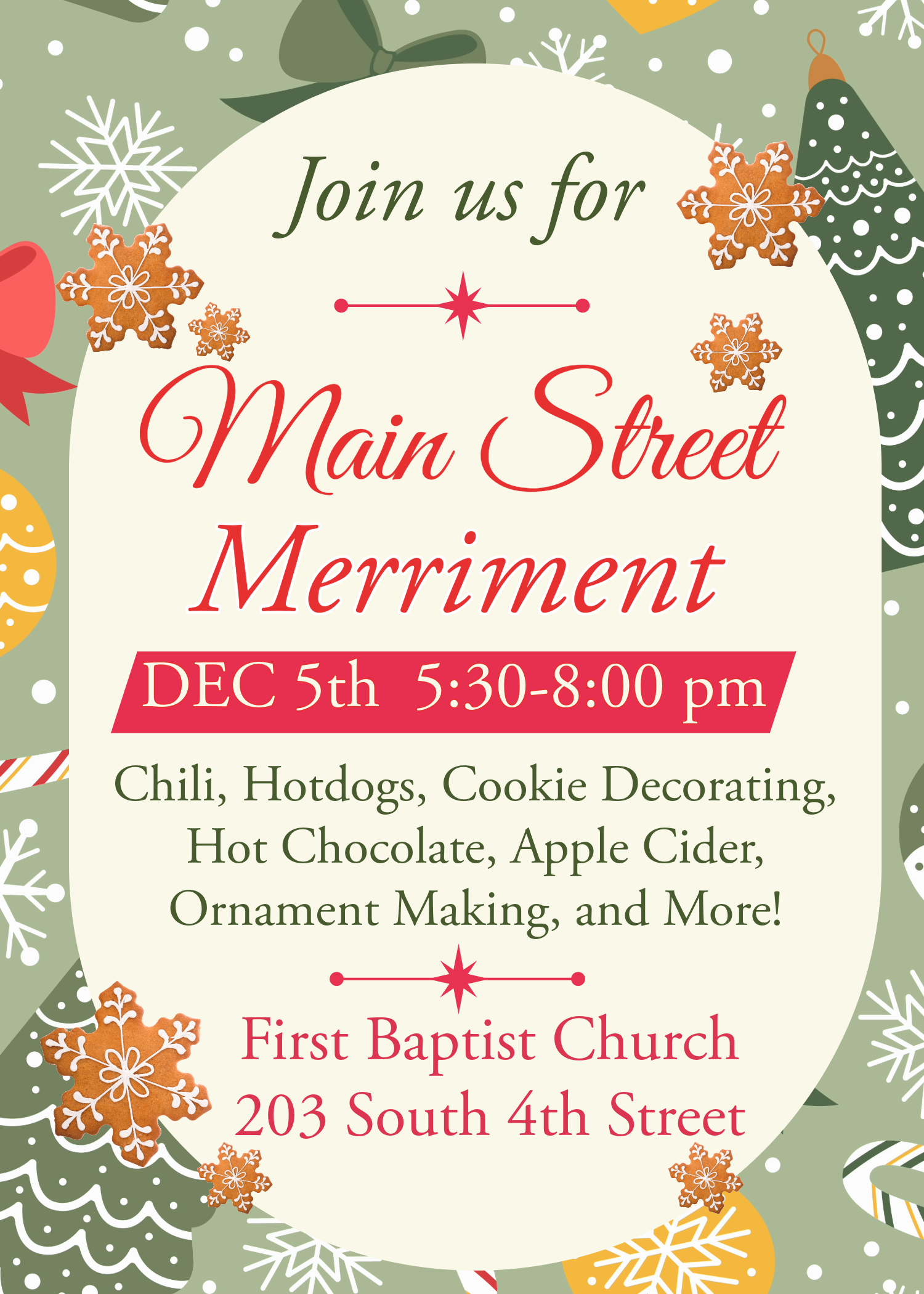 Stop into First Baptist Chu8rch as a part of Main Street Merriment and enjoy hot chocolate and hot apple cider, snacks and holiday crafts!