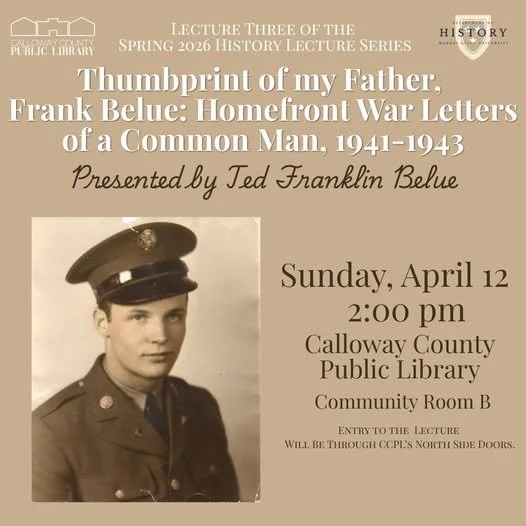 The annual Murray State University Department of History and Calloway County Public Library Community Spring History Lecture Series will conclude on Sunday, April 12, 2026, at 2:00 PM in CCPL’s Community Room B. The guest speaker will be Ted Franklin Belue, who will present Thumbprint of my Father, Frank Belue: Homefront War Letters of a Common Man, 1941-1943.