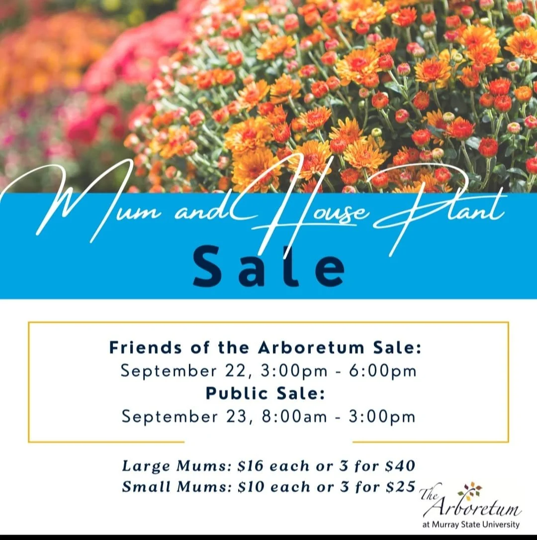 Mum & Houseplant Sale @ Doran Arboretum Saturday, September 23, 2023 8:00 AM 3:00 PM Google Calendar ICS The Mum Sale is September 23rd! Make plans to attend. Thank you in advance for your continued support of the Hutson School of Agriculture. Large Mums $16 or 3 for $40. Small mums $10 each or 3 for $25.
