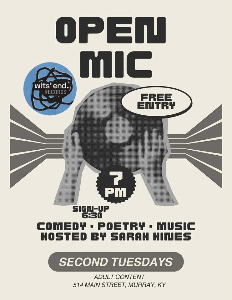 Join us for Open Mic Night hosted by Murray comedian Sarah Hines at Wits’ End on the second Tuesday of the month! Comedy, music, poetry, and more are welcome. Sign-up is at 6:30pm, show at 7! Perform up to two songs or five minutes of spoken-word (comedy/poetry).