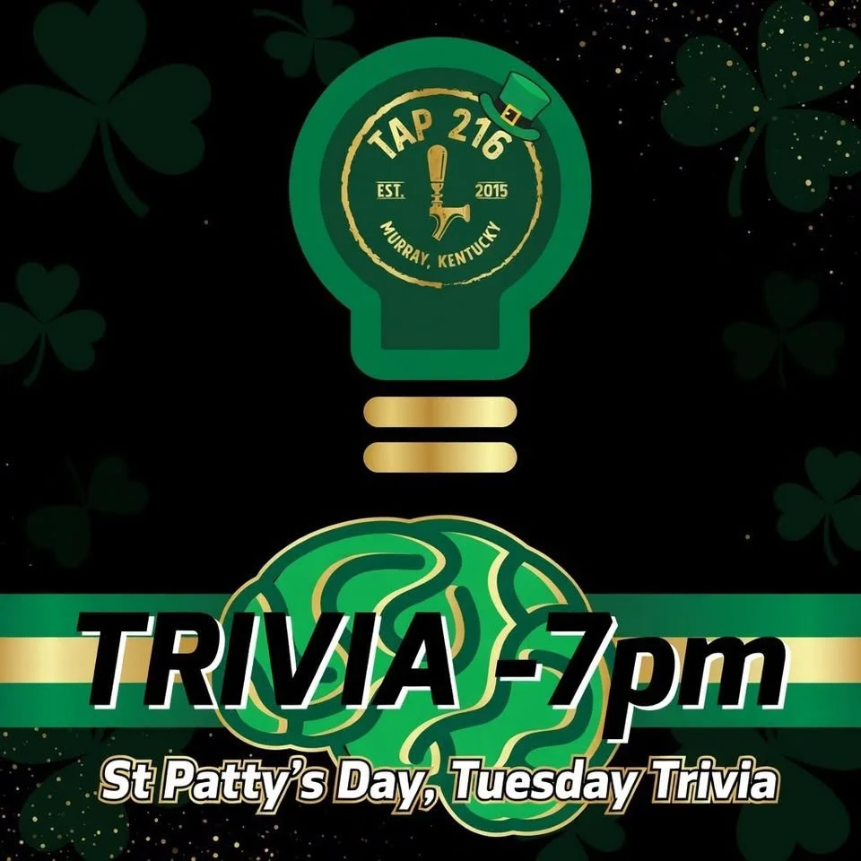 St Patty’s Day celebration with Tuesday Trivia! Wear your Green and get ready for a Green Beer!