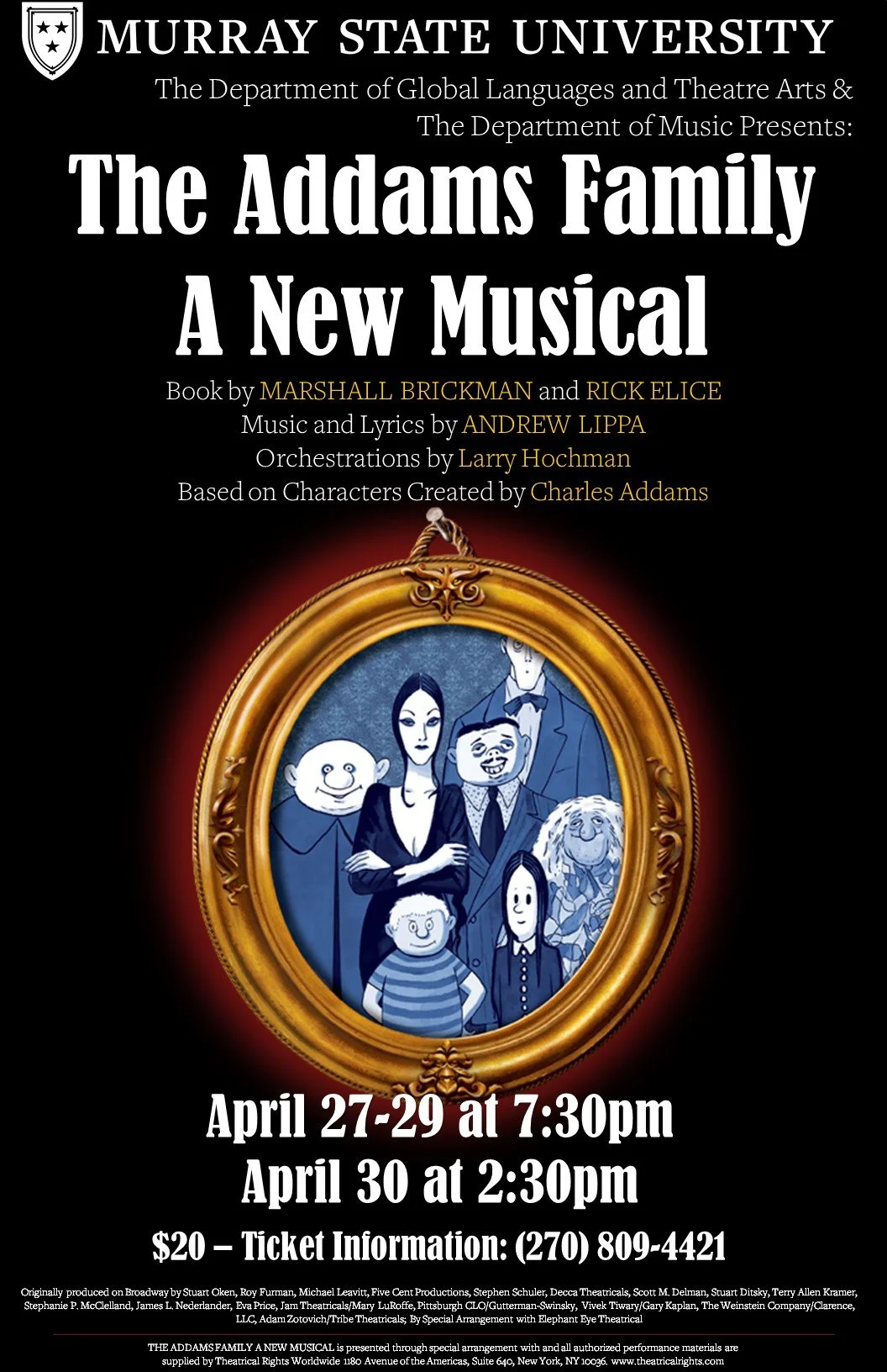 The Murray State University Department of Music and the Department of Global Languages and Theatre Arts are pleased to present “The Addams Family,” a musical based on the book by Marshall Brickman and Rick Elice, with music and lyrics by Andrew Lippa. Performances will be on Thursday, April 27 – Saturday, April 29 at 7:30 p.m. and on Sunday, April 30 at 2:30 p.m. in the Johnson Theatre on Murray State’s campus. General admission is $20 per person.