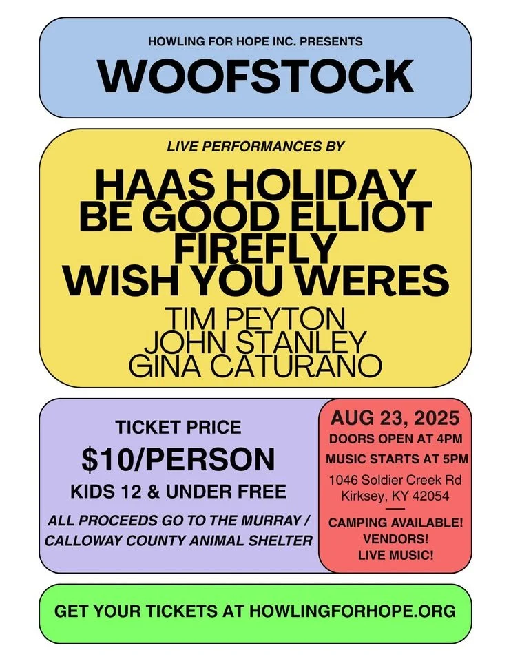 Woofstock: A Day of Music, Art & Community for Calloway County Animal Shelter Join us on August 23rd for Woofstock, an all-day celebration at the legendary WoodsFest Music Venue, featuring live music, local vendors, and a vibrant creative atmosphere—all in support of a great cause! Enjoy performances from multiple bands, expertly curated by Freedom Sound Productions, browse unique artwork from talented creators, and take part in an exciting raffle with fantastic prizes.